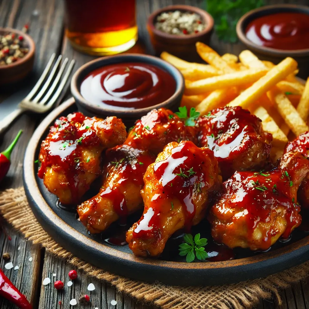 Dumanlı BBQ sosuyla lezzetlendirilmiş çıtır tavuk parçaları.