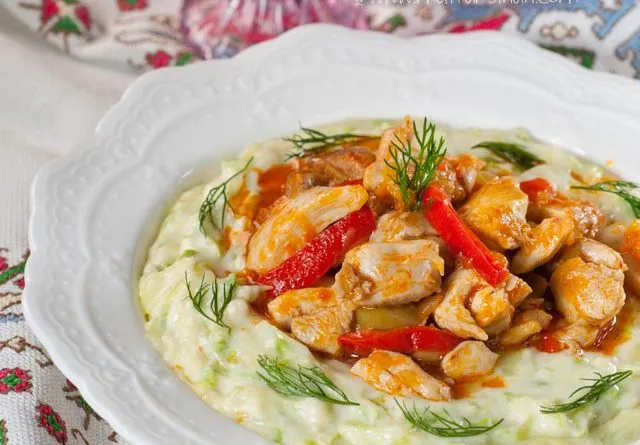 Közlenmiş patlıcan beğendisiyle servis edilen nefis tavuk.
