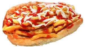 Lezzetli sosis, patates ve özel sosla hazırlanan nefis sandviç.